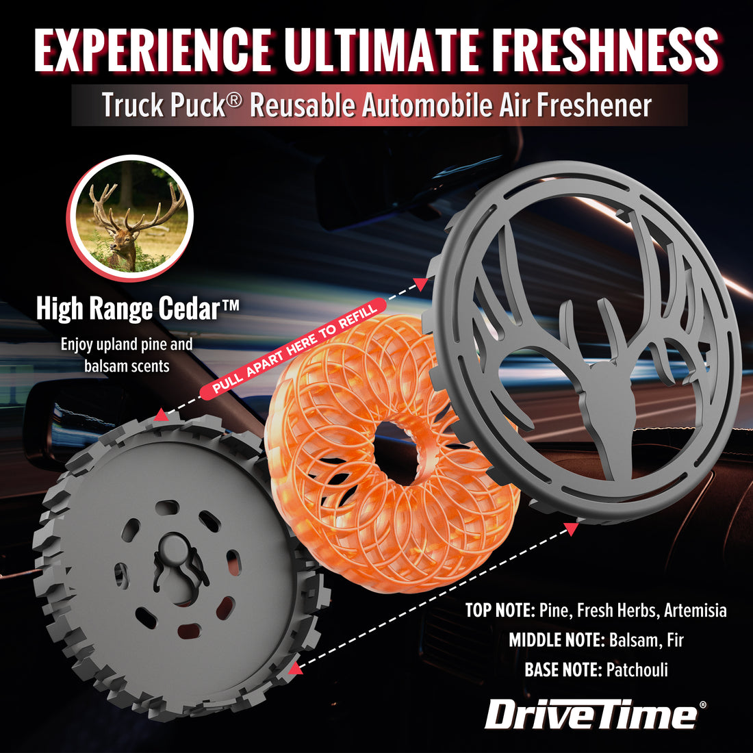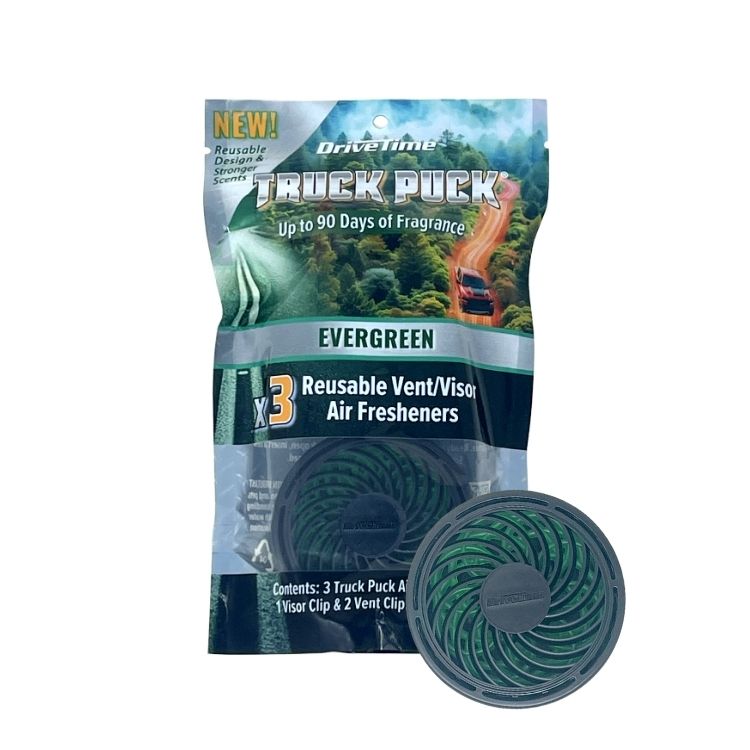 Now it’s time for an upgrade. The Drive Time Truck Puck delivers bold scent in a solid, refillable design that never melts, leaks, or lets you down.
